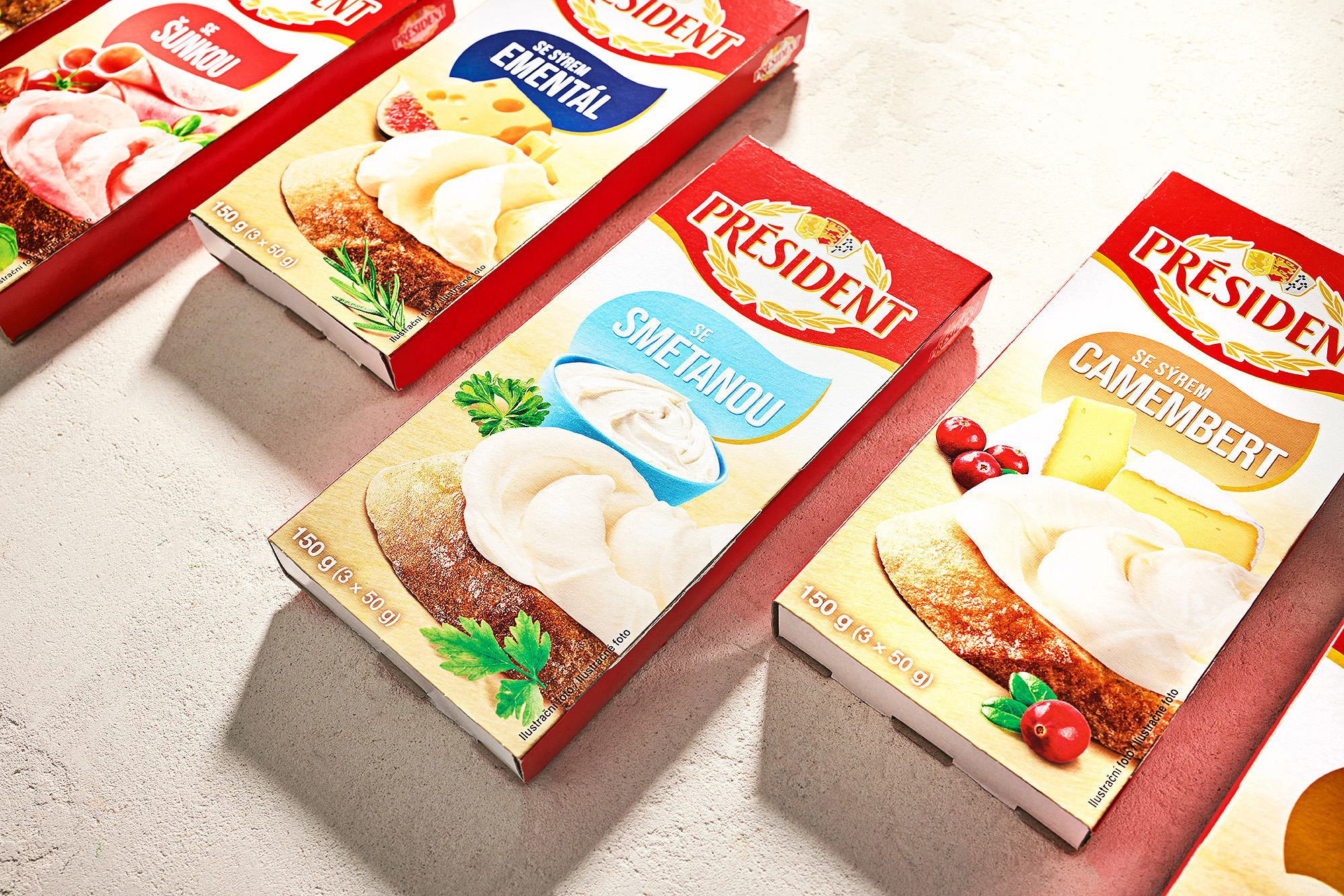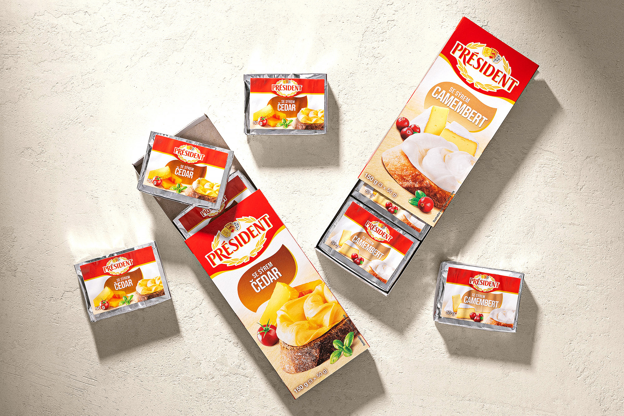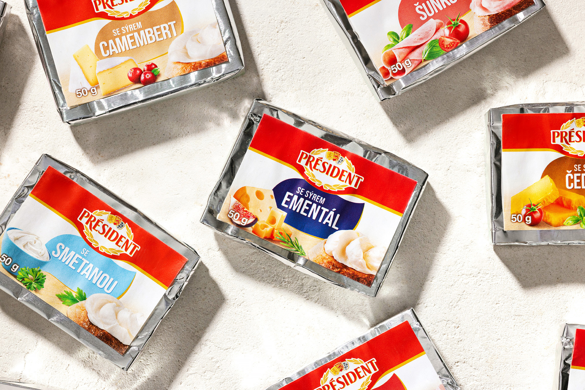 Voor het merk Président hebben we een complete visuele set verpakkingen voor een reeks smeltkazen ontworpen. Het project omvatte foodstyling, productfotografie en grafisch ontwerp en bewerking van aanpassingen voor een reeks van acht hoofdverpakkingen.